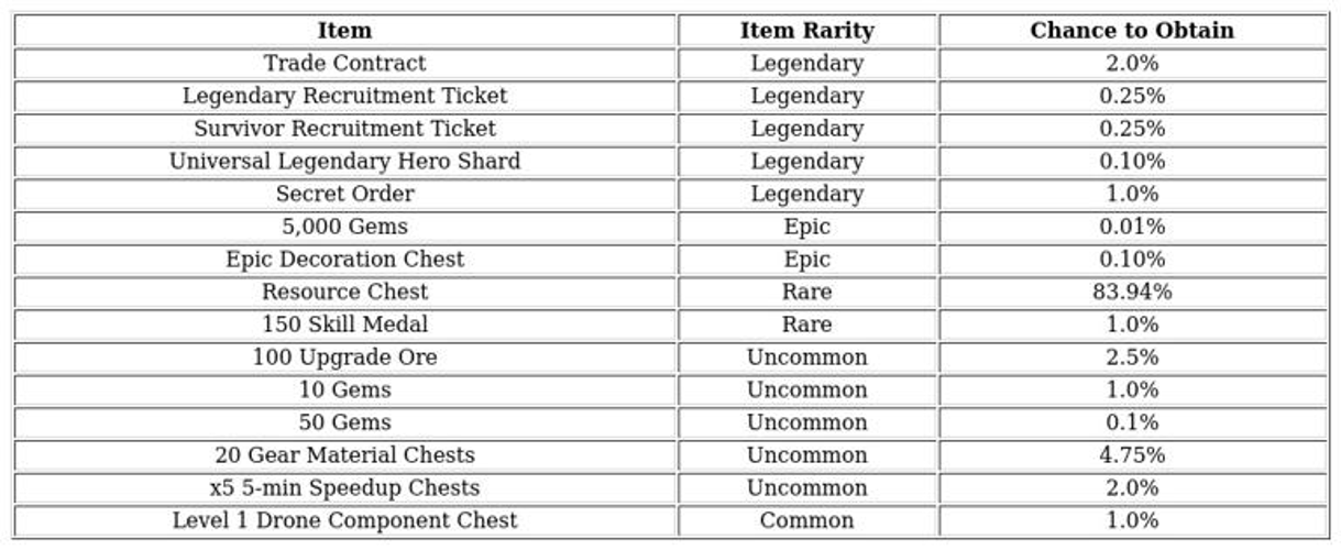 When opening Last War Survival Mystery Supply Boxes, players encounter a diverse array of items, each with its own probability of drop. The most common reward is resource chests, which boast an impressive 83.94% drop rate. These chests contain vital resources such as 10,000 food, 10,000 iron, or 6,000 coins—crucial for building, upgrading, and crafting. Additional items include gear material chests (4.75%) and speedup chests (2%), which help accelerate development.