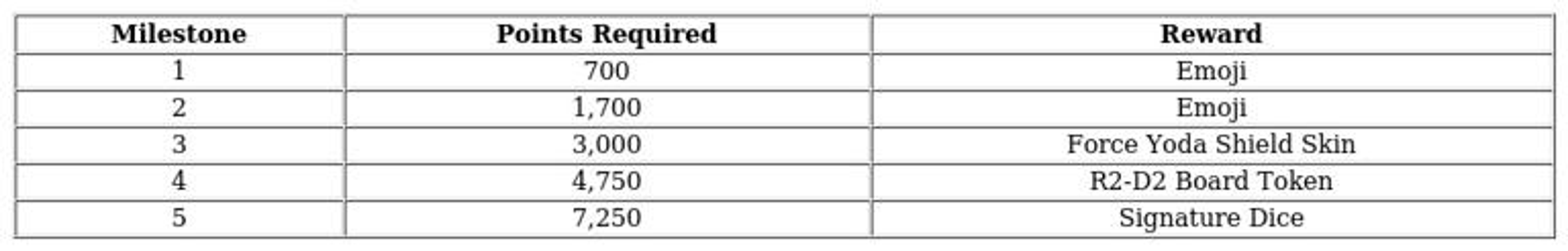 To obtain the R2-D2 token, players need to achieve milestone #4 on the initial page of the current Peg-E Deluxe event. Refer to the table below to find out the number of points required to reach this milestone and secure the coveted token.