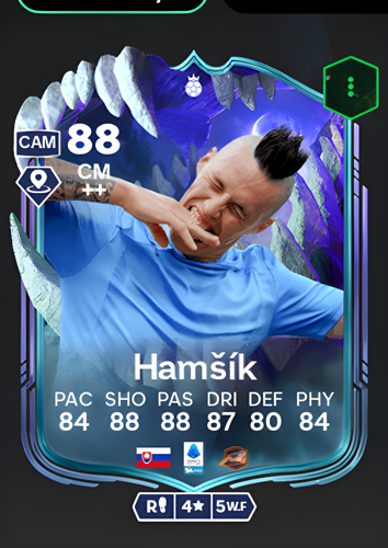 Marek Hamšík's Ultimate Scream Hero card emerges as a formidable Center Midfielder, boasting an impressive overall rating of 88 that underscores his elite status. This card features a well-rounded and powerful attribute spread, with standout ratings in shooting (88), passing (88), and dribbling (87), complemented by strong pace (84) and physicality (84), while even his defensive capability is solid at 80. As a central midfielder, these attributes translate into a dominant box-to-box presence, allowing him to orchestrate play with pinpoint passes, drive forward with skillful ball control, and unleash powerful, accurate shots from distance. This versatility makes him a pivotal engine in midfield, capable of both creating decisive opportunities and contributing defensively, helping to control the tempo of the game and break down the opposition to seal crucial victories.