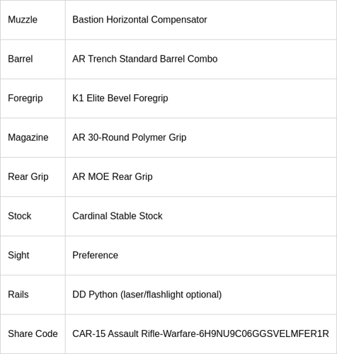 This CAR-15 configuration effectively minimizes horizontal recoil for up to 15 consecutive shots, making it easier to maintain accuracy during extended bursts. Since vertical recoil is already manageable, removing most horizontal sway significantly improves shot precision, especially against targets located over 40 meters away. However, keep in mind that if your burst exceeds 15 rounds, the weapon will begin to drift to the right.