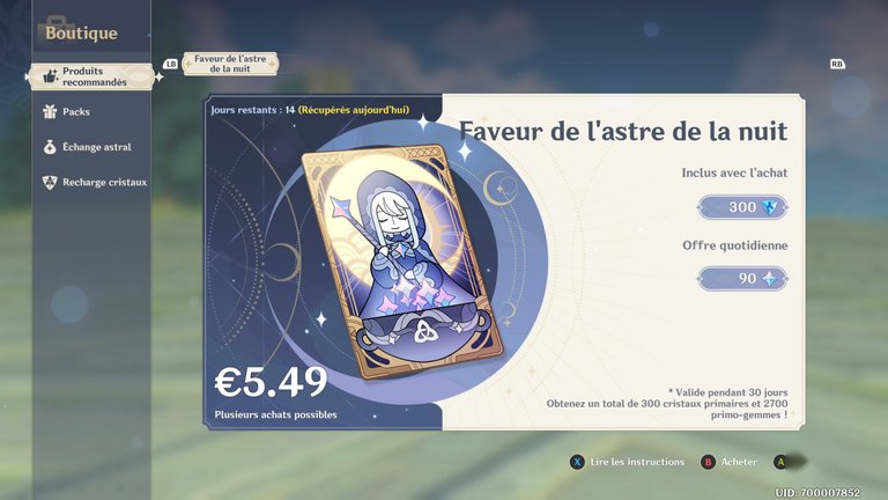 La Faveur de l'astre de la nuit, accessible via la boutique, représente un engagement mensuel.