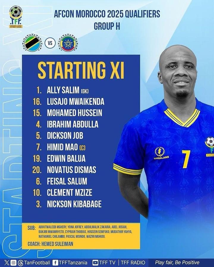 Kikosi cha Timu ya Taifa @TaifaStars_ kinachoanza kwenye mchezo wa kufuzu AFCON 2025 dhidi ya Ethiopia