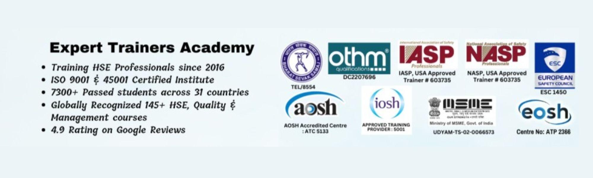 Expert Trainers Academy is a leading institute for Safety, Engineering, and Quality Management training. We offer global certifications such as IOSH, OSHA, ISO Lead Auditor, and OTHM. Our mission is to guide learners with expert-led courses that build careers, ensure workplace safety, and meet international standards.